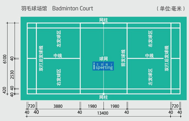 羽毛球場(chǎng)為長(zhǎng)方形,長(zhǎng)13.40米,雙打場(chǎng)地寬為6.10米,單打場(chǎng)地寬為5.18米。球場(chǎng)上各條線寬均為4厘米,丈量時(shí)要從線的外沿算起。球場(chǎng)界限最好用白色、黃色或其它易于識(shí)別的顏色畫(huà)出。